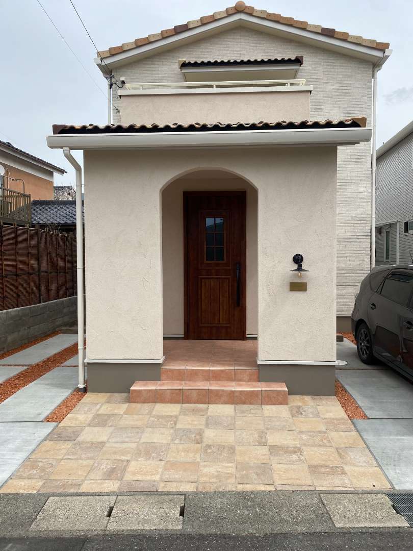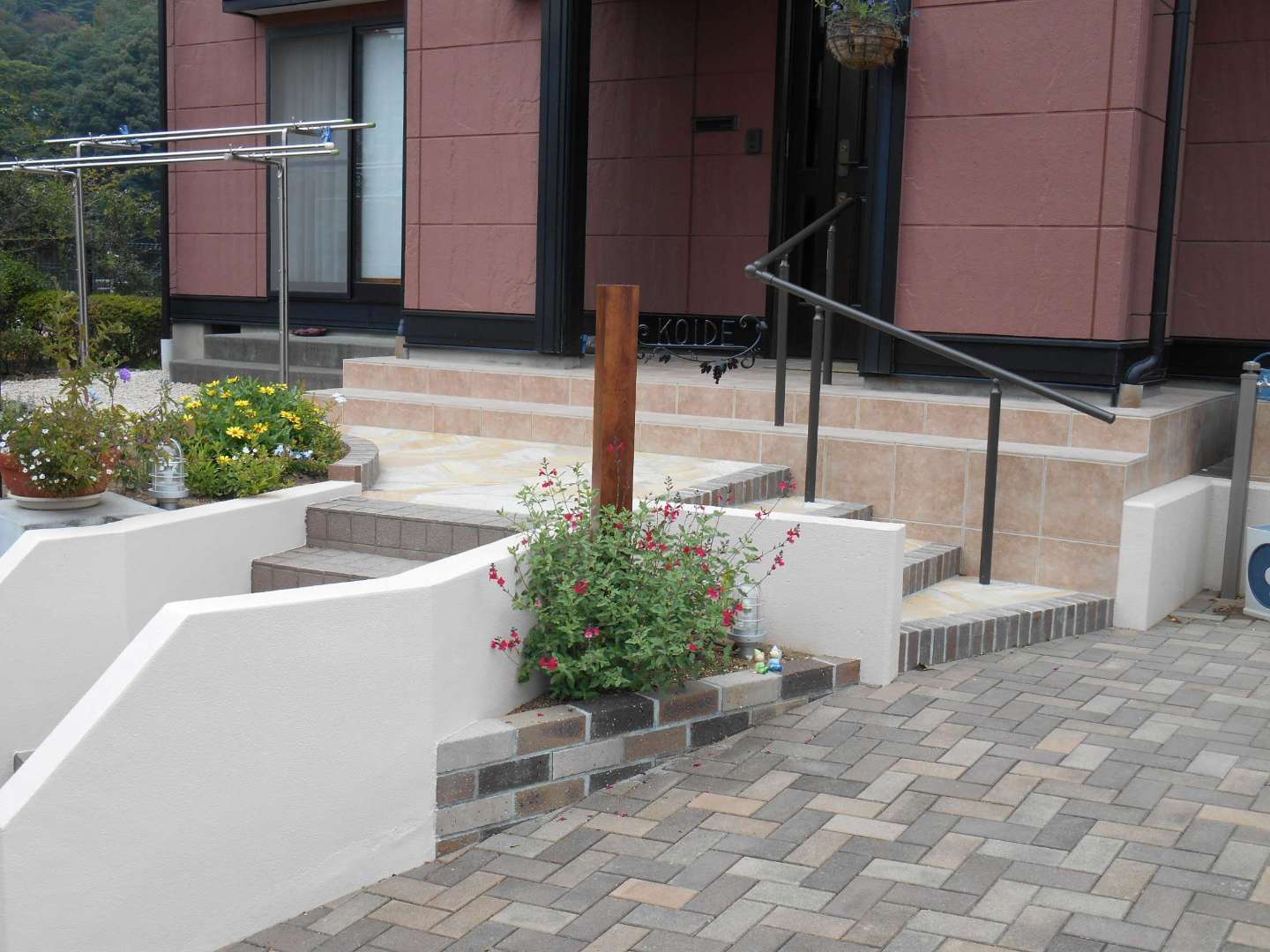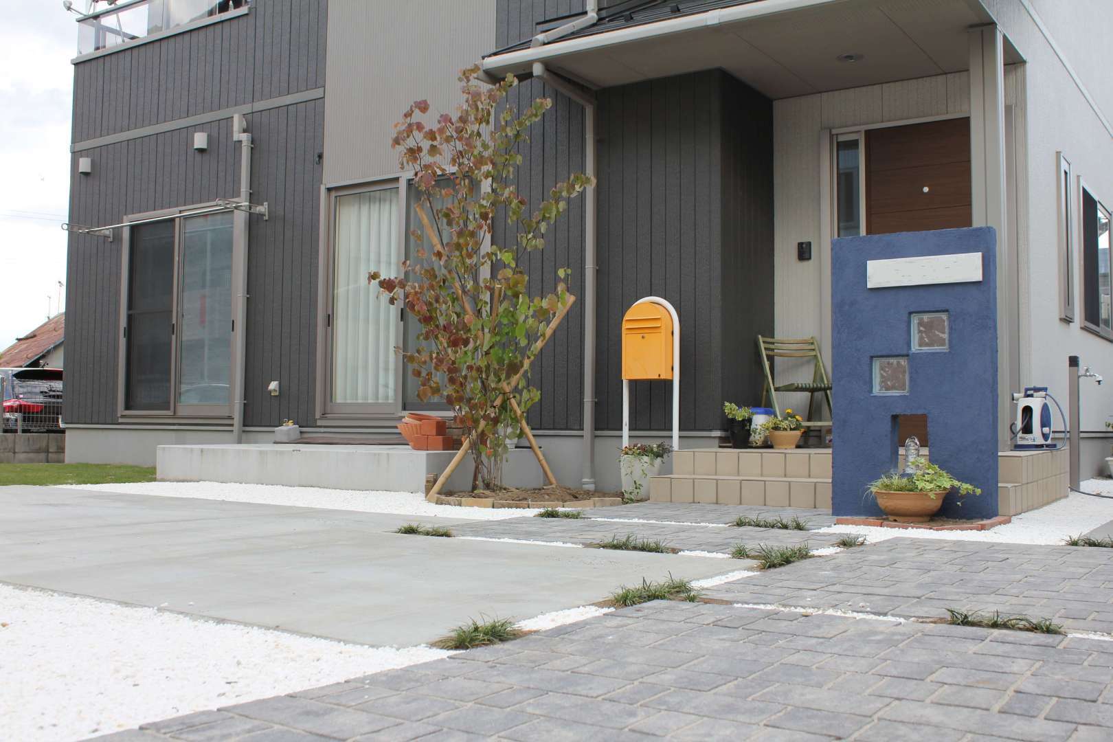 玄関やアプローチをインターロッキングブロックで舗装すると、雨の日でも滑りにくく、おしゃれな雰囲気になります。