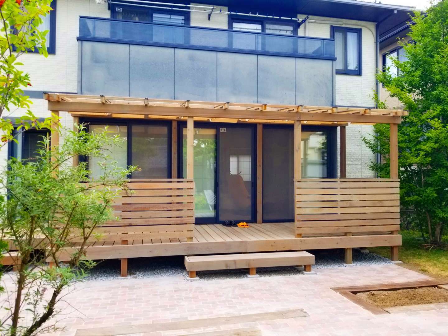 テラスやデッキ周りをインターロッキングブロックで作ると、