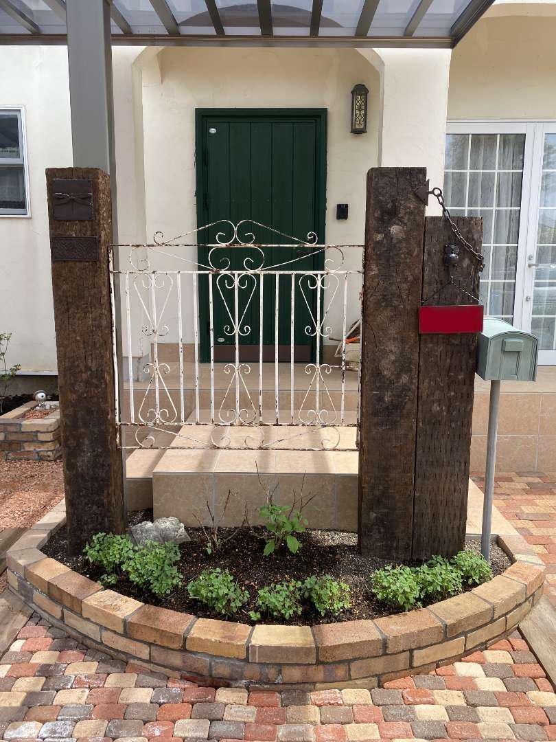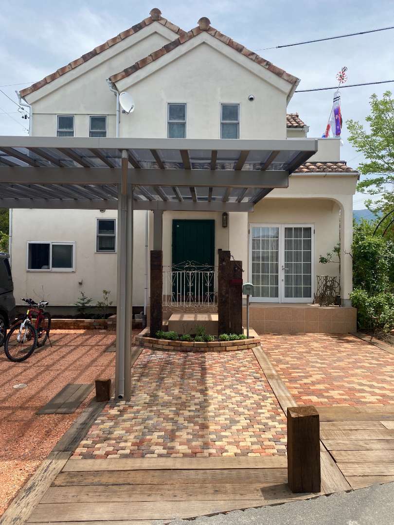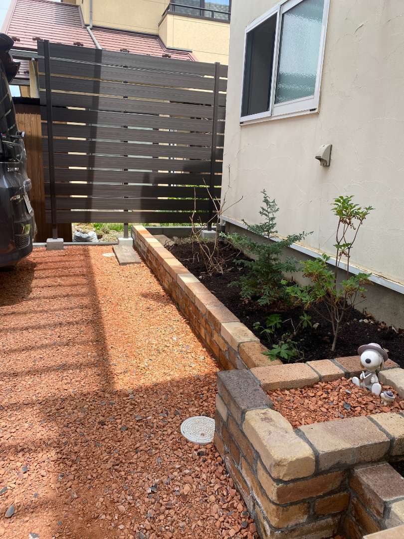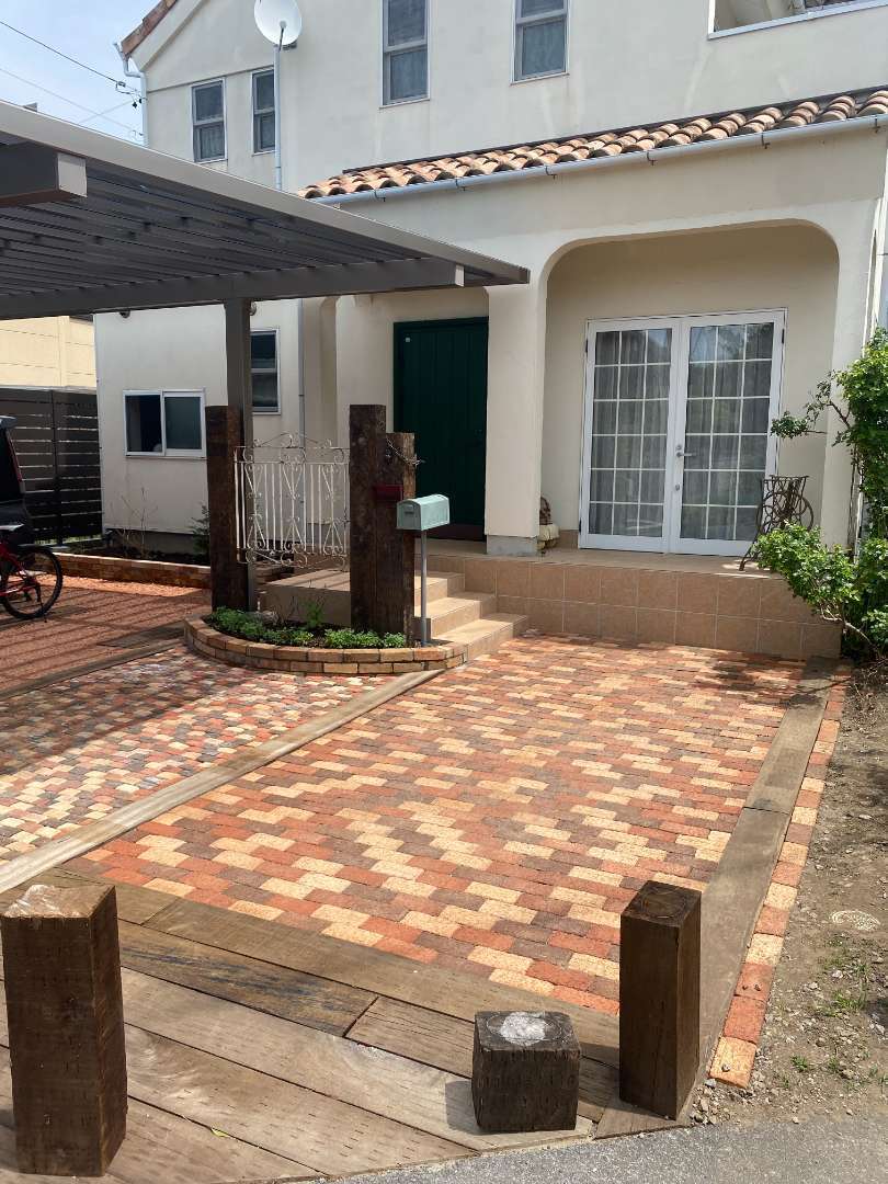 ・カーポート・玄関ポーチ増設・門柱・レンガ花壇・枕木敷込み・瓦チップ敷き・目隠しフェンス