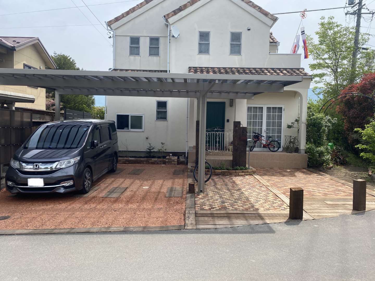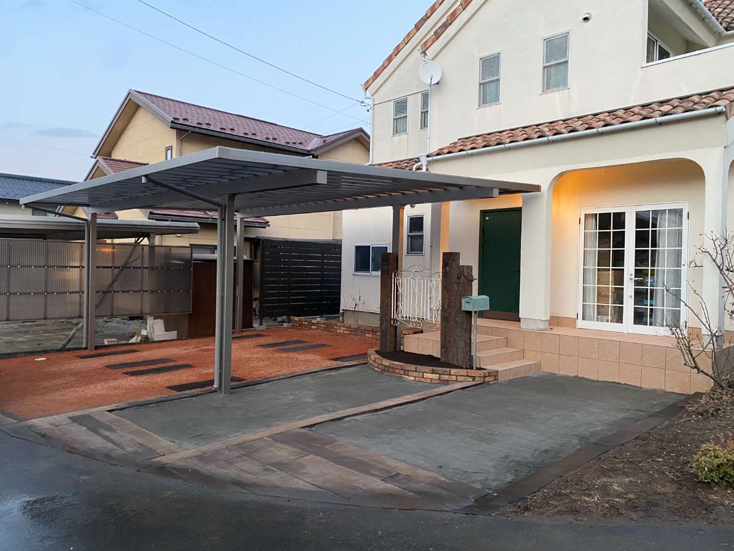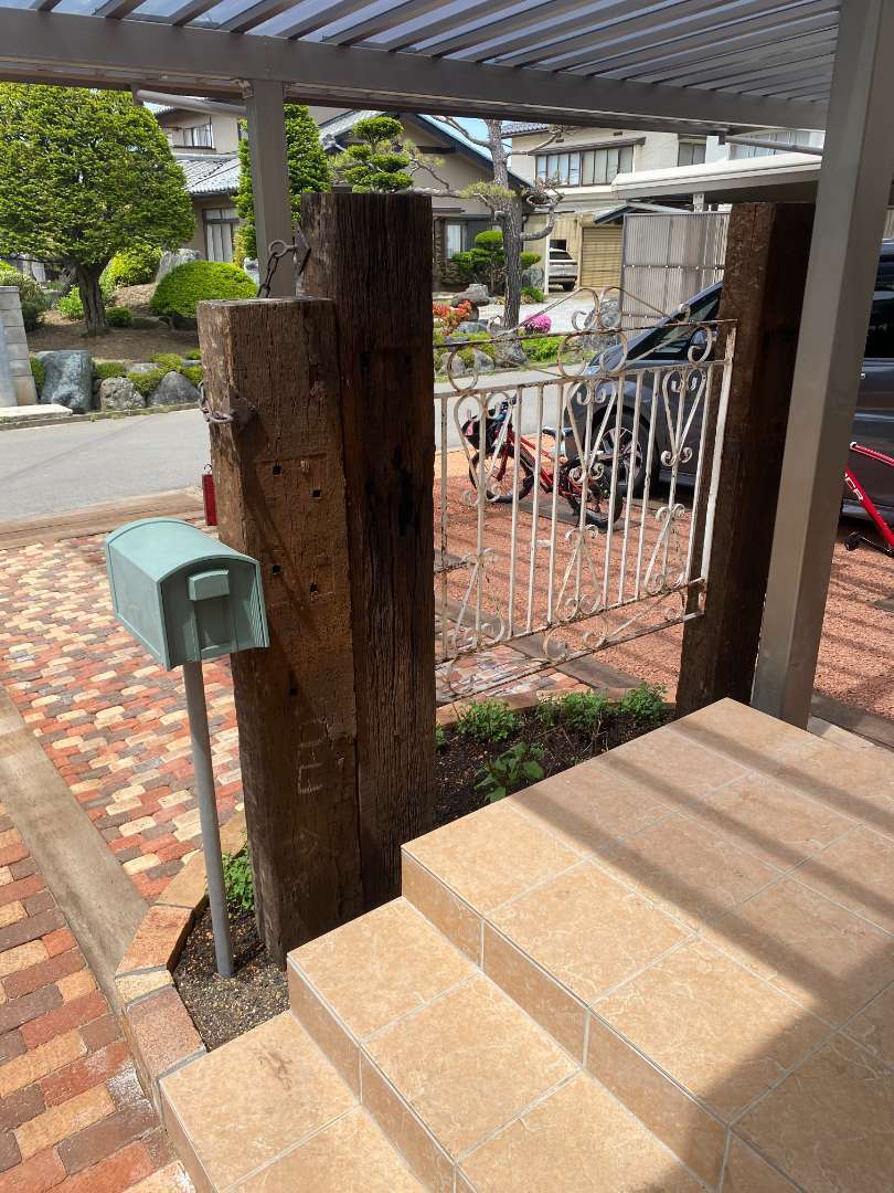 ・カーポート・玄関ポーチ増設・門柱・レンガ花壇・枕木敷込み・瓦チップ敷き・目隠しフェンス