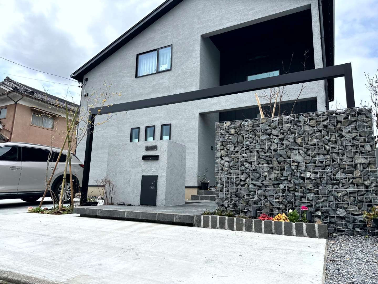 ファサード全体をシャープに引き締めるブラックのGフレームは、門壁と調和し、スタイリッシュな雰囲気を醸し出しています。