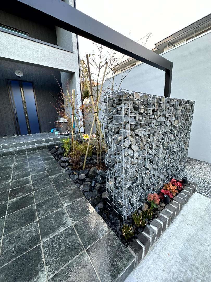無機質な印象になりがちなガビオン(蛇籠)ですが、自然石を詰めることで温かみをプラス。植栽との組み合わせによって、モダンでありながらもナチュラルな癒しの空間を創出します。