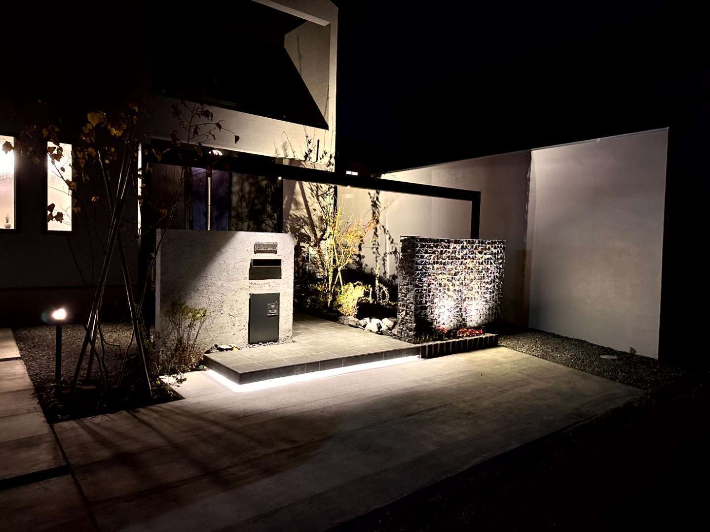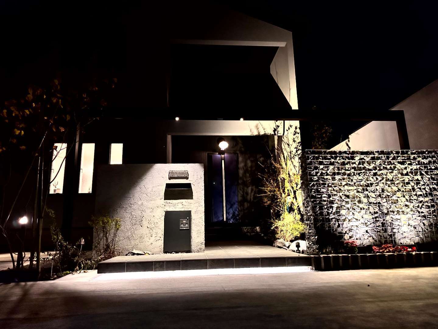 植栽や門壁を照らすスポットライトは、昼間とは異なる幻想的な表情を演出します。ピンコロ石で縁取られた花壇は、季節の花々が空間に彩りを添えます。